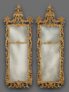 The ormolu decorations on the black marble bases consist of war trophies with scaled shields, quivers with arrows, halberds and flags, the whole topped by palm leaves as a symbol of victory. The very unusual inverted fasces are, even more unusual, topped by armillary spheres and moreover flank Mars, the god of war.