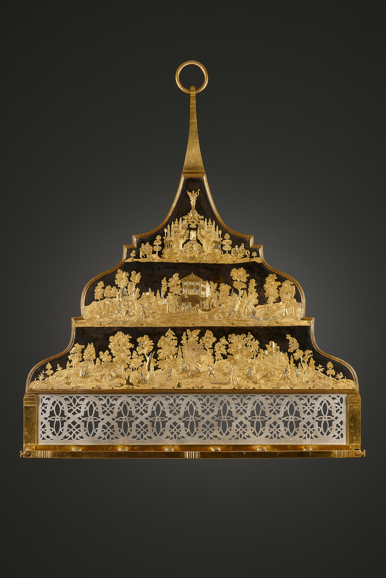 Below these three ornamental sections is an openwork silvered copper grille with a complex, elegant pattern of flowers and loops within geometric lattices. Underneath this grille, the rack’s lower edge is lined with six knobs. These are secured with a movable bar, which can be swung aside to access the knobs, then returned to its original position and locked in place to secure the objects suspended from the knobs.