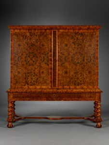 Le cadran en émail blanc a trois anneaux de chiffres. Celle à l’intérieur indique la date en chiffres arabes, le second indique les heures en chiffres romains et l’anneaux extérieur les minutes. Deux aiguilles ajourées en laiton donnent les heures et les minutes et une troisième aiguille en acier donne la date. L’horloge à bande d’ancre a une durée de huit jours.