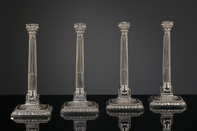 De kandelaars zijn vervaardigd in de vorm van Korinthische zuilen, staande op een vierkante voet met inkepingen op de hoeken. De voeten zijn versierd met een brede formele bladrand, waarboven een parelrand is aangebracht. Cannelures en geappliqueerde guirlandes completeren het geheel. Volledig gemerkt binnenzijde voetrand met trembleerstreek eronder. Gemerkt met het herkeur van 1795 voor Amsterdam op voetrand.