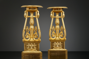 Een verguld bronzen presse-papier in de vorm van een liggend kader met centraal een zeer fijn zijden borduurwerk met de voorstelling van de moord op de koningszonen. Aan weerszijden van het boorduurwerk, dat zich binnen een versierde opstaande rand bevindt, in een hengsel bevestigd dat gevormd is als twee sierlijke slangen die elkaar in het midden ontmoeten met de opengesperde bekken rond een vrucht.